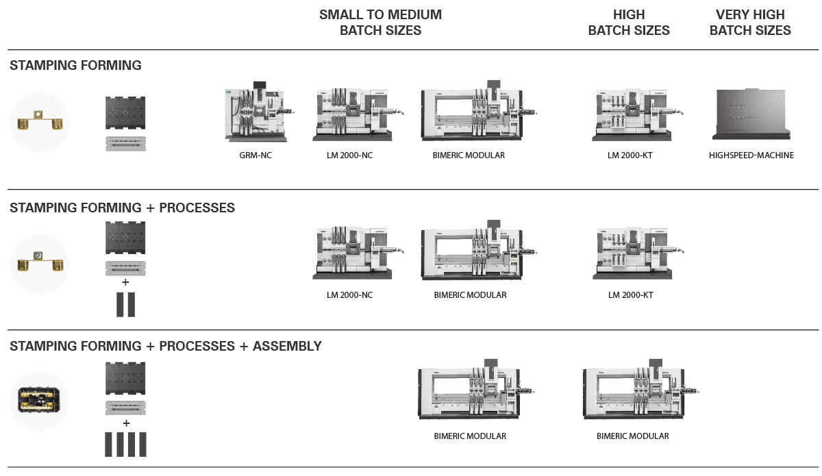 You can choose which Bihler machine is right for you. Our machines meet all of the requirements of the production world, whether it be small-, medium- or large-batch sizes, or low value added, or high value added by way of additional processes. Each of our five machines is compatible with all of the others. All use uniformly designed linear forming tools that offer great flexibility, and can be quickly reused or relocated, or, if necessary, they can be modified, depending on the product life cycle of the components. Each of the five machines provide all of the advantages of the full Modular Series.