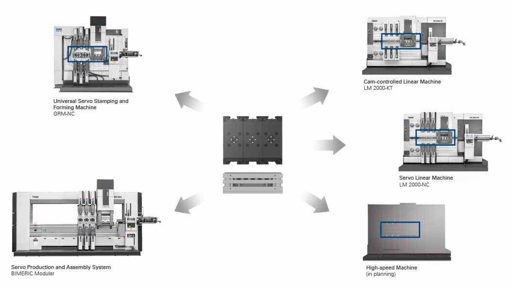 All machines have standardize d interfaces and a zero-point clamping system with hydraulic clamping functions. This makes them fully compatible with each other in terms of the linear stamping and forming tools used. A direct assignment of tool to machine is completely eliminated.