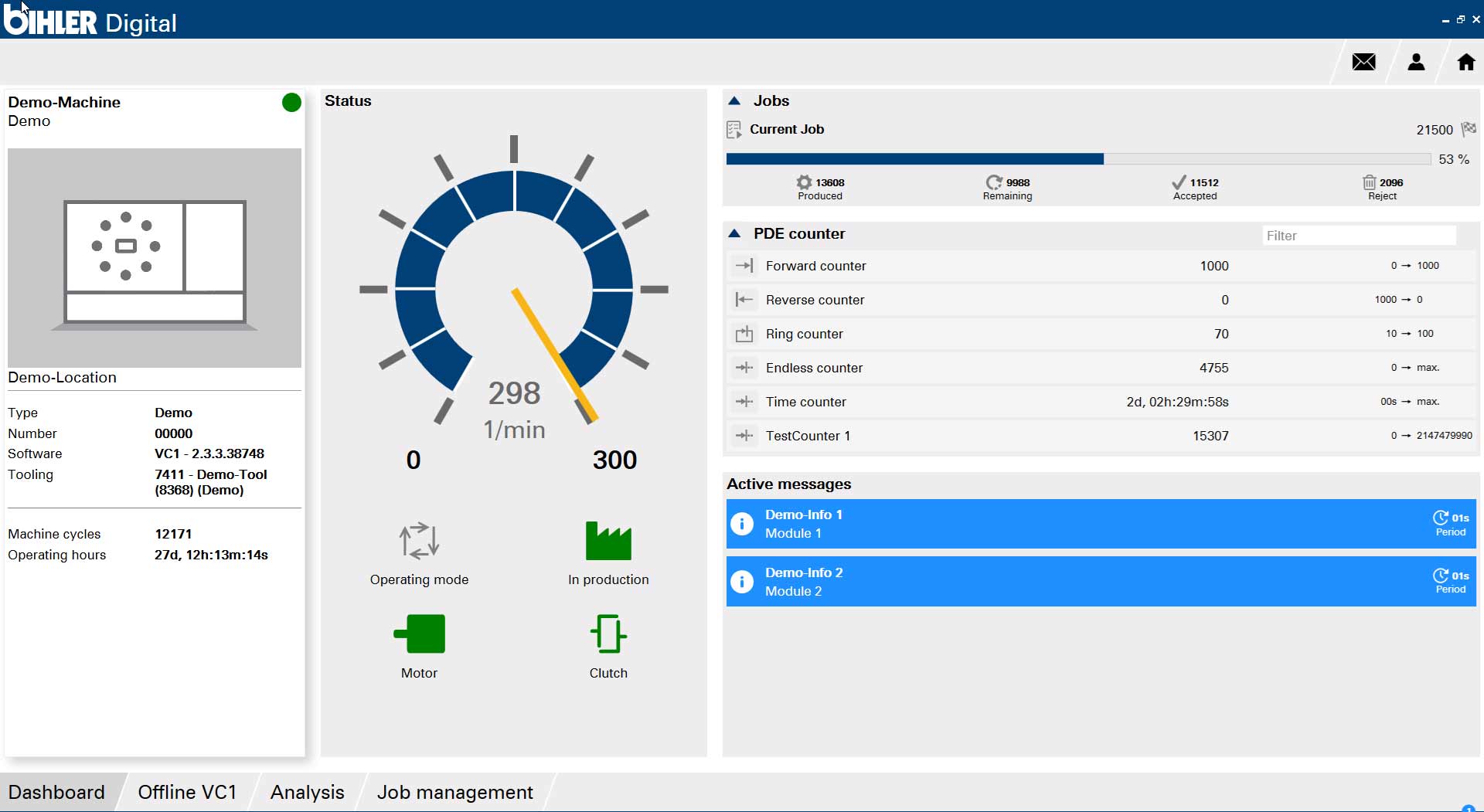 La “Bihler Digital App” è attualmente composta dal “pacchetto base” con panoramica delle macchine e dashboard per la gestione delle macchine attraverso una chiara visualizzazione in tempo reale dei sistemi Bihler, nonché dai quattro moduli aggiuntivi utilizzabili in modo flessibile “Analisi”, “Offline VC 1”, “Gestione degli ordini” e “Animazione”.